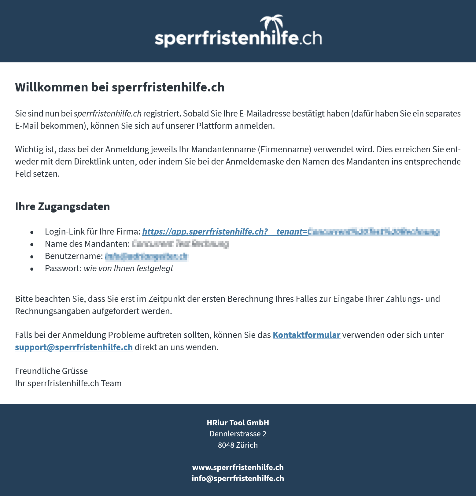 Diese Informationen werden auch per E-Mail an die oben definierte E-Mailadresse verschickt. Falls Sie das E-Mail nicht erhalten haben, dann schauen Sie bitte auch in Ihrem Spam-Ordner. Behalten Sie dieses E-Mail, für den Fall, dass Sie später wiedermal den Mandantennamen oder Login-Link benötigen.